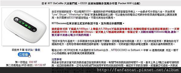 日本 NTT DoCoMo 大流量門號 + E5331 高速無線隨身寬頻分享器 Pocket WiFi 租用連結 想"發露"帆帆貓的最新旅遊資訊就卡緊來按讚啦~(不要忘了讚之後要到粉絲團設定成接收全部訊息喔)