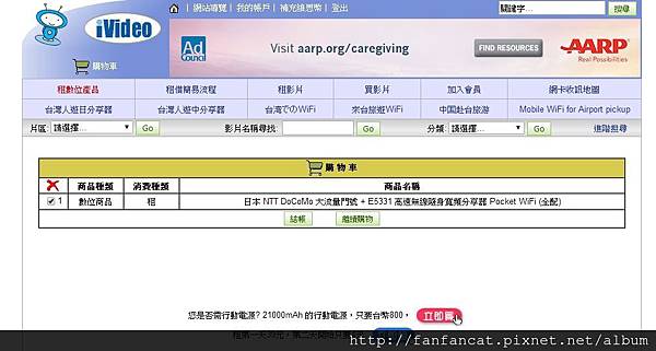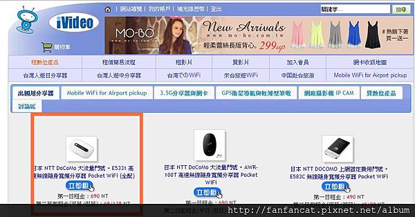 進入iVideo網頁後,選擇上方橫幅的第一個選項<租數位產品>,再選擇下方橫幅<出國用分享器>,出現的第一台"小白"就是E5331,第一天的租借費用是690元,第二天開始平日是69元,假日是138元。