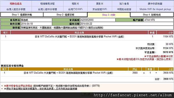 選好日期按下一步,就會出現付款明細,必須注意用信用卡刷卡時會有押金3900元,押金不會出現在信用卡帳單,在商品還件後三天內就會取消授權,另外因為是物流配送的關係,會有配送的物流費30元。