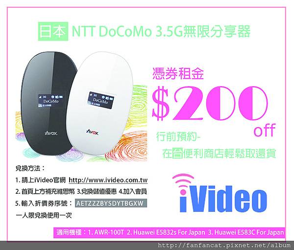【日本上網超好康】來來來~你來,這麼讚的日本上網優惠怎麼可以錯過,現在只要點進部落格文章上按讚+留言告訴帆帆貓你最想去日本的哪裡玩,就抽價值千元的iVideo小白機租用折價卷,讓你不用帶狐狸面具也可以隨時招喚小白啦!(活動時間至4/30止喔!) 文章連結:http://fanfancat.pixnet.net/blog/post/176594481