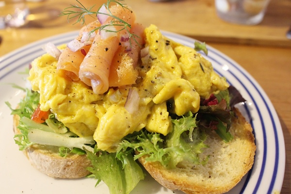 酸麵包上佈滿生菜、滑蛋和煙燻鮭魚層層堆疊