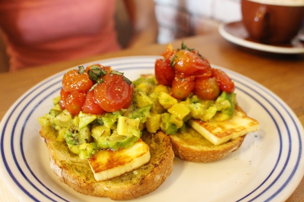因為這道我沒吃到不知口感如何,我就直接引用天下雜誌的介紹:銷售排行第一的「哈魯米起司」,將澳洲進口獨特風味的起司兩面煎過,口感竟有點像肉,風味是鹹Q奶蛋,選用法式酸麵包,上面堆疊著炒過的蜜蕃茄、酪梨、起司、青醬松子,多重層次的美感與風味,口味絕不會跟其他家「撞衫」!