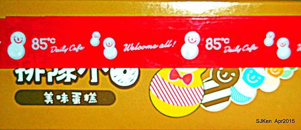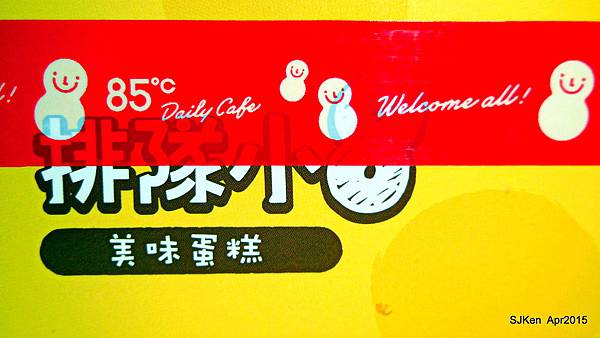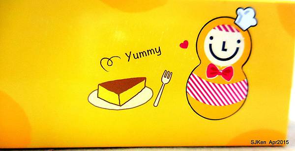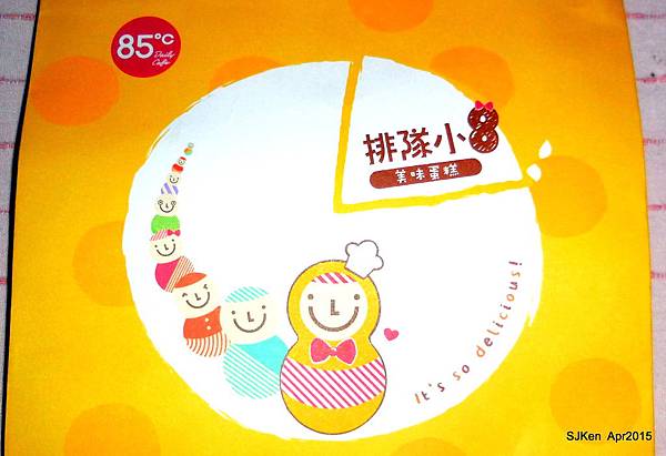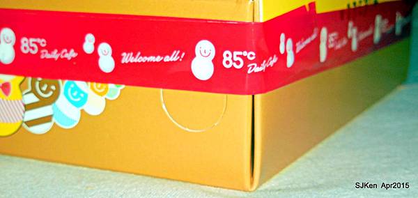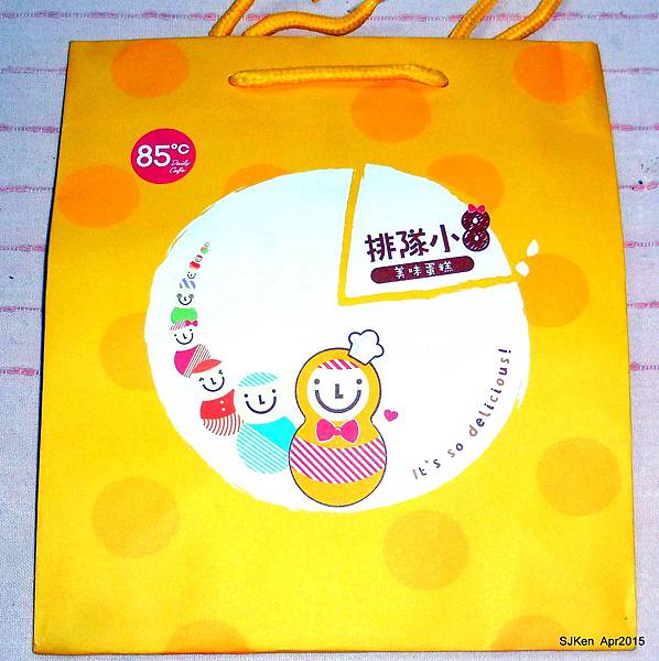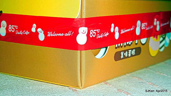 手提袋跟起士派盒都是以亮黃色系為主的設計,上有85度C與副牌「排隊小8」的名稱,還有一堆造型可愛十分討喜的微笑小雪人十分吸睛,然後上面有張貼紙寫著「北海道極濃起士派 四種誘人的秘密」,點出了手作4層夾心的產品特色。