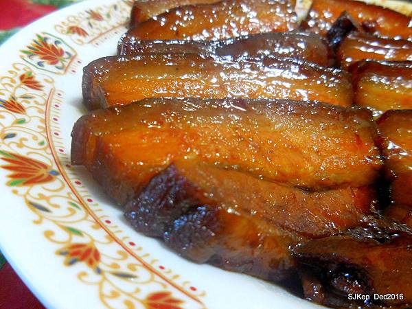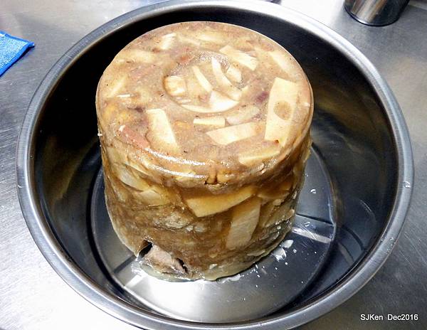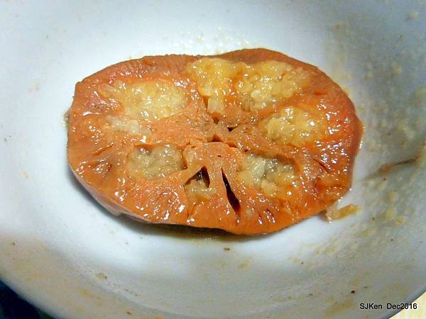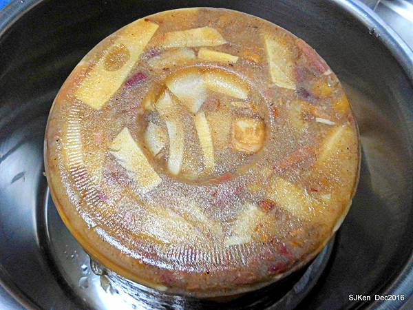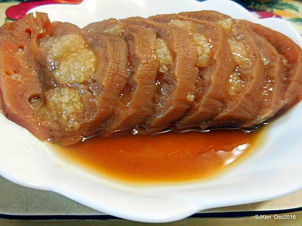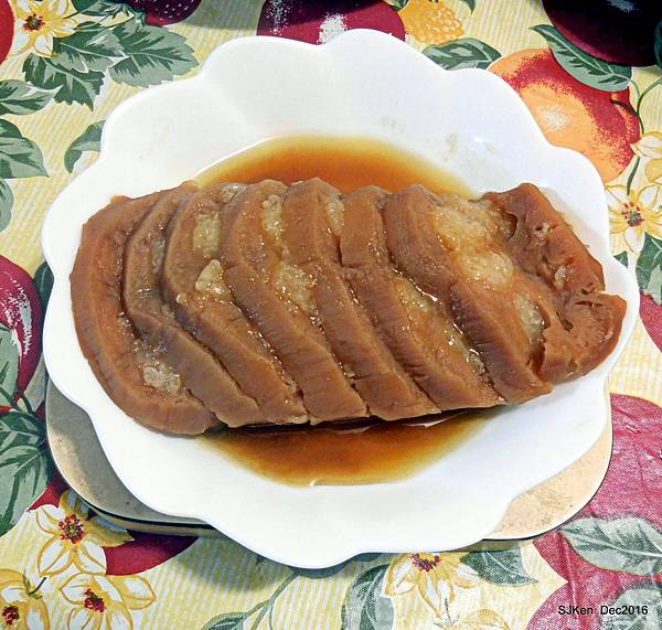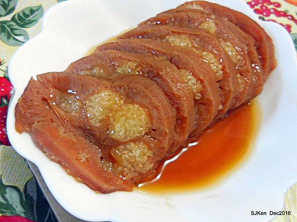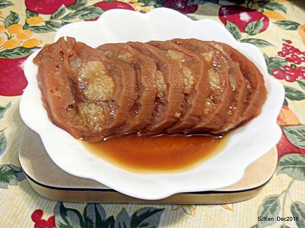 第五道「冰糖蓮藕」是道素食年菜,「億長御坊」嚴選新鮮的蓮藕,塞進糯米費時 6 ~ 8小時製作而成,是道蠻費時的菜色,淋上甜醬汁蒸熱後食用,切好片的冰糖蓮藕口感香甜鬆綿,軟嫩好入口,吃過後餘韻綿綿舌尖生津。