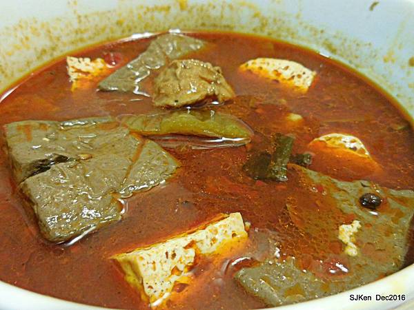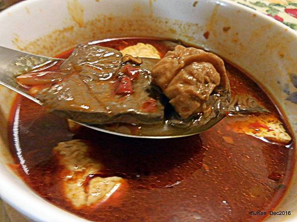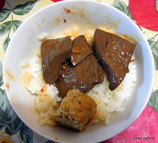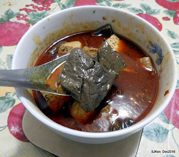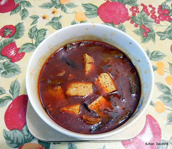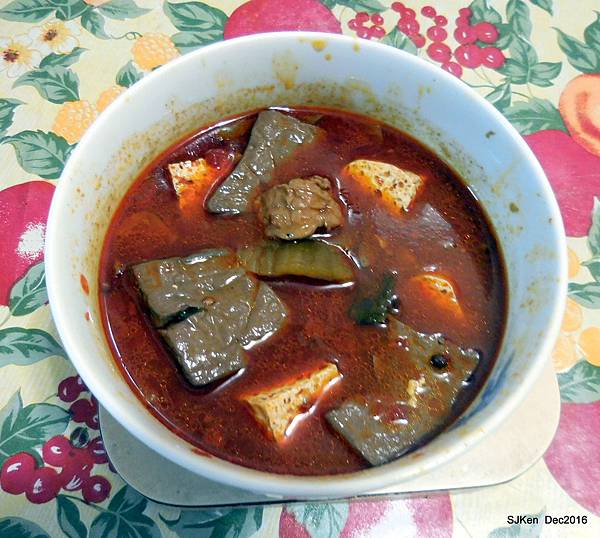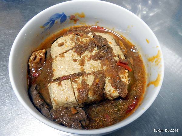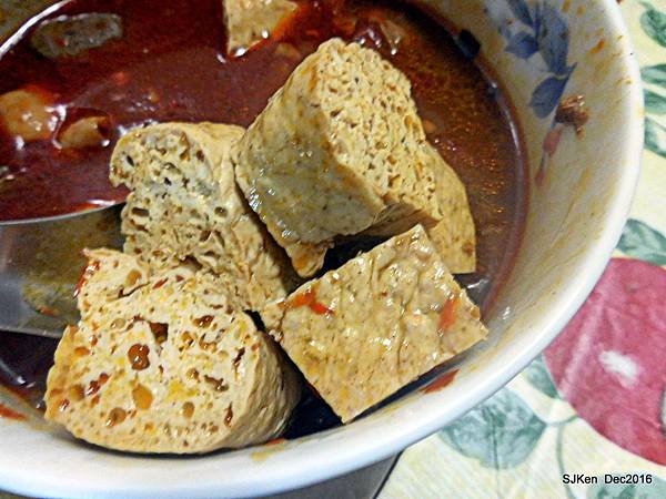 第四道品嚐的是辣勁十足的「臭豆腐腸旺」,「億長御坊」使用非基改臭豆腐製作,解凍經電鍋蒸煮後,一打開香氣四溢,小小一碗用料一點都不馬虎,有大腸、鴨血與臭豆腐,佐以花椒湯頭,鴨血入口無比滑嫩,臭豆腐香氣十足,大腸軟耐咀嚼,同樣也是很下飯的一道菜,入口辣度十足,吃完身心整個溫暖熱和!