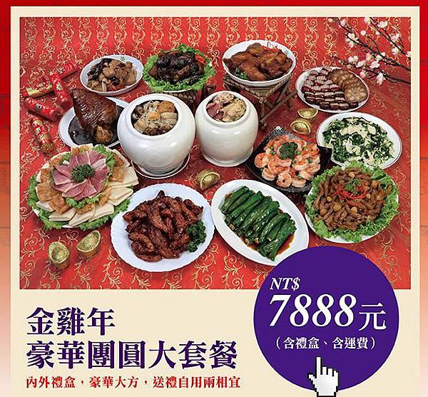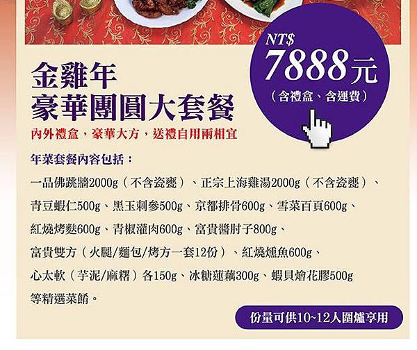 2017金雞年年菜套餐組合,除了這次享用的「招牌套餐組」外,「億長御坊」也特別為2017年金雞年,推出了適合10至12人的「[url=https://panel.pixnet.cc/blog/%20https://tw.mall.yahoo.com/item/% ... 2%BB-p0832119853921]金雞年豪華團圓大套餐[/url]」(NT$7,888,內含一品佛跳牆、上海雞湯、青豆蝦仁、蔥燒黑玉刺參、京都排骨、雪菜百頁、紅燒烤麩、青椒灌肉、富貴醬肘子、富貴雙方(火腿、麵包、烤方一套12份) 、紅燒燻魚、心太軟(麻糬.芋泥) 、冰糖蓮藕與蝦貝燴花膠),以下兩張圖片引用自「億長御坊」官網。