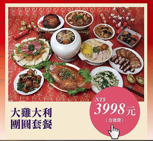 以及適合六人食用的「大雞大利團圓套餐」(NT$3,998,內容包括有一品佛跳牆、酸菜白肉鍋、福菜扣肉、豆瓣紅魚一尾、.富貴雙方(12份)、臭豆腐腸旺、雪菜百頁、油燜筍、紅燒烤麩、左宗棠雞丁、.心太軟與冰糖蓮藕),以下兩張圖片引用自「億長御坊」官網。