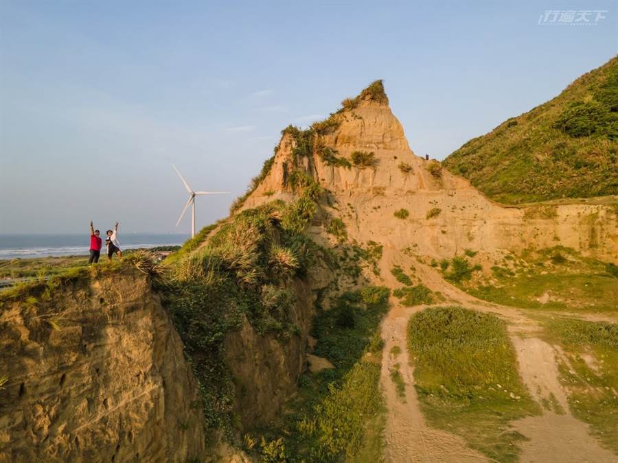 卻意外成了具有大峽谷景觀的地貌;小心翼翼爬上山,腳下就是一望無際的海天一線。遠方,可以看見發電用的風車在藍天白雲間轉動,遼闊的視野,心情也跟著開朗了起來。