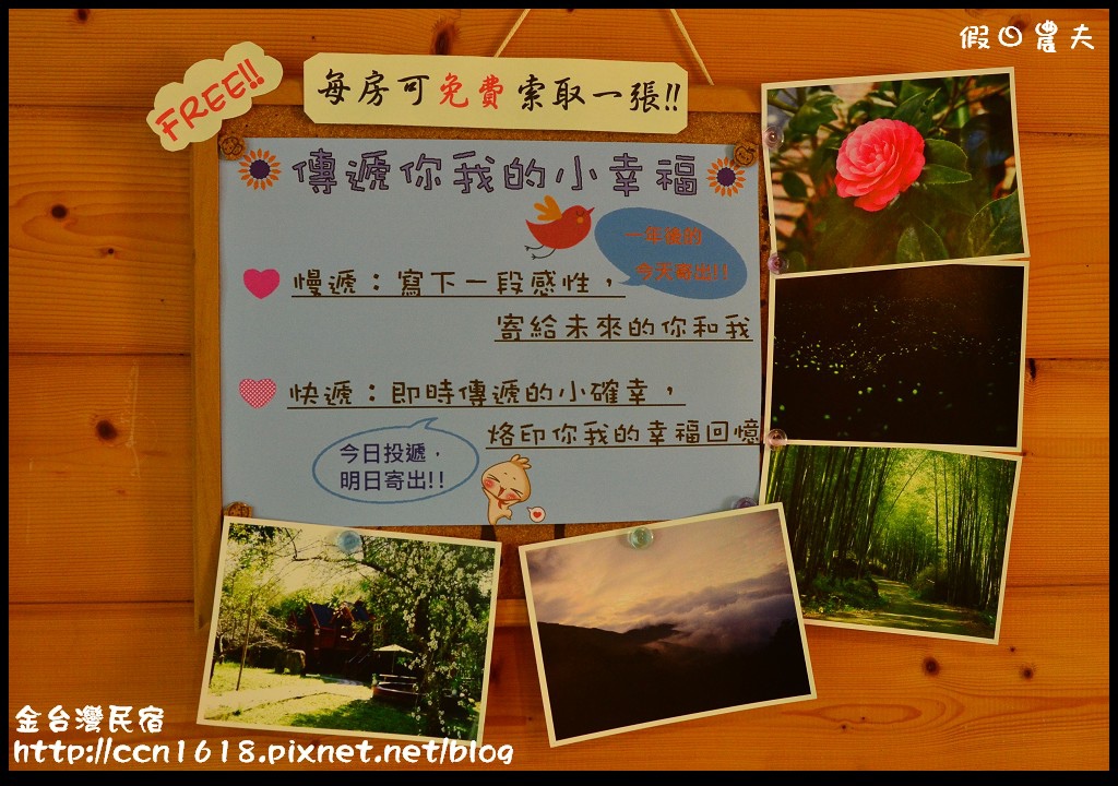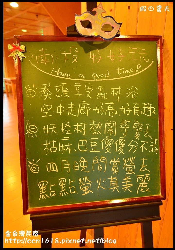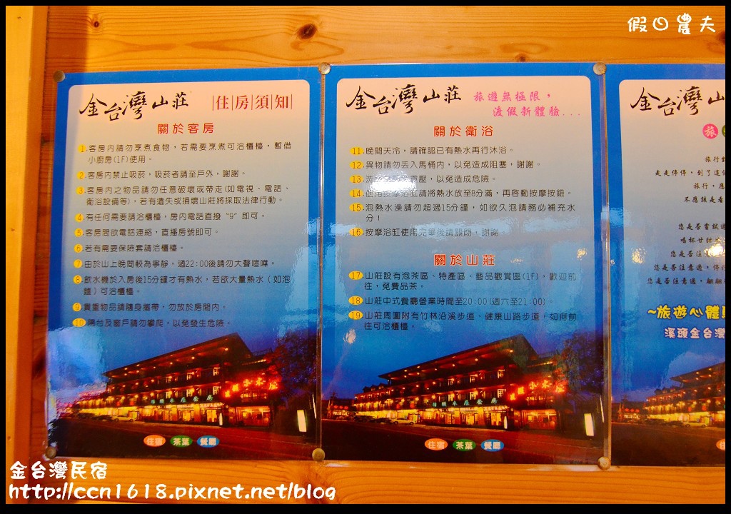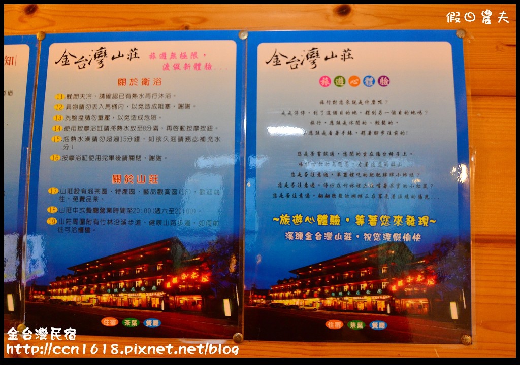 主要是因為要來住宿金台灣山莊,金台灣山莊距離三生緣園區只要10分鐘車程,溪頭妖怪村只要5分鐘車程 到忘憂森林、杉林溪也只要30分鐘車程,可說是到溪頭地區旅遊住宿的好選擇 金台灣山莊經營項目包括民宿、餐廳、高山茶和奇木藝品 我有問民宿老闆為了維護住宿品質並沒有接陸客團,但是有很多港澳自由行會透過訂房網站自行訂房 整棟金台灣山莊都是用實木裝潢 住宿接待櫃台前有可愛的小熊陪客人坐搖椅 這裡的服務人員也很親切,都會介紹附近好玩的景點 還有看牌介紹 準備進房間了,連走道都是實木裝潢,老闆應該很喜歡木頭 今天說的是寬敞的四人房 同樣都是實木裝潢 接著來看浴室 有按摩浴缸耶,如果白天先去溪頭做森林浴,晚上再泡個澡一定很舒服 高級飯店才有的免治馬桶,沒想到在金台灣民宿裡也有 洗臉台 住房須知和山莊設備服務介紹 房間裡就有飲水機,不用特別煮水,上面放的茶包是自家生產的 備品用的是依必朗 不過吸引我的是旁邊的椅子,很特別 後來有問老闆,原來的構想是拿牛車的前輪來做椅子,後來車輪不多就用訂做的 金台灣山莊也有經營奇木藝品,所以山莊裡到處可見美麗的木雕 另外金台灣也是茶農,一樓有免費品茶區請大家喝茶 喝到喜歡的再買沒關係,保證比外面買的便宜又道地 四五月賞螢季節會帶大家去三生緣園區賞螢火蟲,先在一樓集合並說明賞螢須知後出發 第二天早上是個好天氣 從房間陽台看出去就有漂亮風景,非常有渡假的感覺 早餐在地下一樓用餐,採自助式方式自取 以中式清粥小菜為主 不喜歡吃中式的也有烤土司可以選擇 吃飽後逛逛附近的環境,這是後面的獨棟木屋,好像是歐洲森林的小屋喔 還有皇家馬車在前面 金台灣是合法的民宿喔 住宿還可以索取明信片,可以寄給自己也可以寄給朋友 第二張螢火蟲是我拍攝的作品 可以快遞也可以慢遞,快遞就是隔天就幫你寄出,慢遞則是隔一年後在寄出 溪頭-金台灣山莊 地址:南投縣鹿谷鄉內湖村興產路25-2號 電話:(049)275-4064 傳真:(049)275-5389 相關閱讀 歡迎按讚加入假日農夫愛趴趴照粉絲團