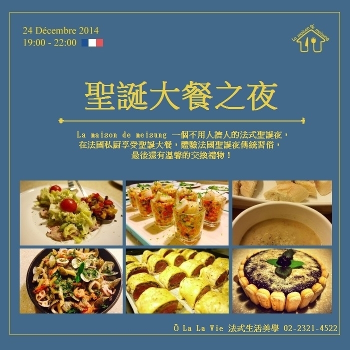 | 簡介: | 一個不用人擠人的法式聖誕夜--我們和刀叉私廚合作,精心為15位喜愛法國的朋友,準備道地的美食及美酒,更和您一起分享法國聖誕夜的傳統習俗.最後還有交換禮物活動!2014的聖誕夜,邀您和我們一起渡過。 |