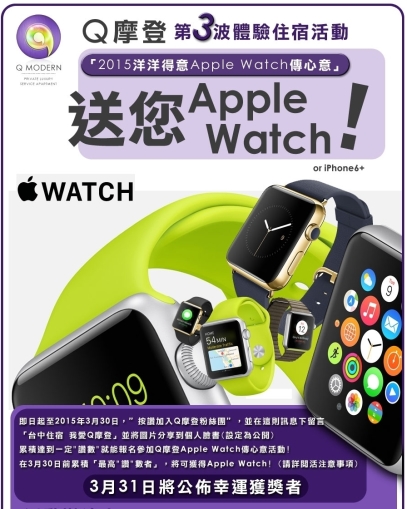 1. 按讚加入Q摩登,指定活動訊息下留言「台中住宿 我愛Q摩登」 2. 公開分享指定圖片到個人臉書,號召好友來按讚!! 3. 達到一定讚數,就可參加活動! 4. 3/30日前累積最多讚數者,獲得Apple Watch!!! (3/31公布得獎者)