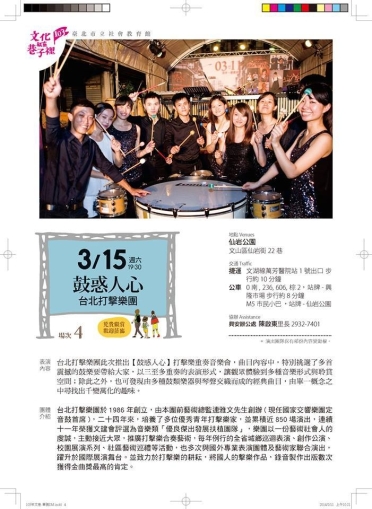 我們走出美麗的音樂殿堂, 讓彼此的距離,更加貼近。星期六(3/15)的晚間七點半,大家不妨來到仙岩公園,挑選個好位置,跟著台北打擊樂團,來場音樂派對吧! 地點:仙岩公園(仙岩街22巷) 捷運:文湖線萬芳醫院站1號出口(步行約10分鐘)