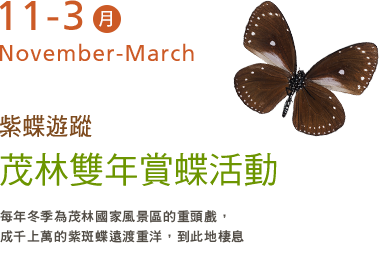 『2015 – 2016台灣茂林紫蝶幽谷‧雙年賞蝶季系列活動』邀請大家一起來共同觀賞!!究者用來專指紫斑蝶群聚越冬的生態現象)。