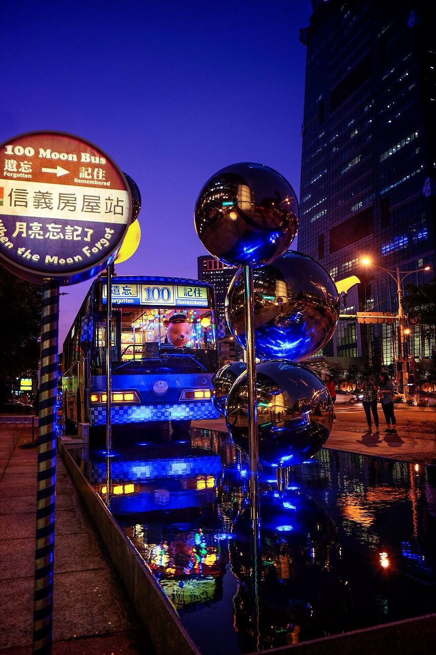 寫著「遺忘、記住」的100路公車,靜靜地矗立在一片平靜的水池上,車頂上一個小男孩舉起雙手,正要把月亮送回天空。這是幾米繪本故事《月亮忘記了》加以改編的裝置藝術,作品就坐落在台北信義路五段跟松智路口、台灣地標台北101的斜對面,公車號碼「100」
