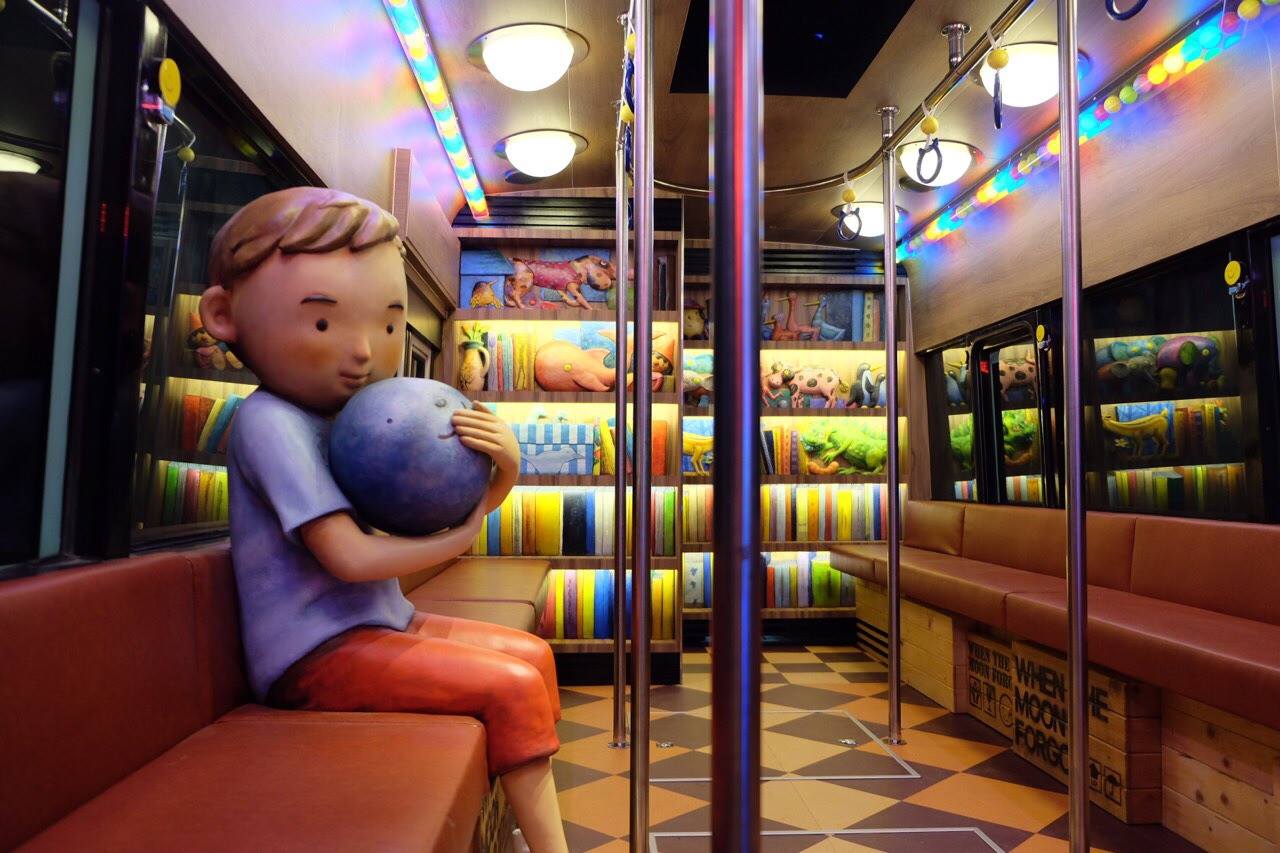 以公車為主體的藝術作品,不僅可以駐足觀賞、拍照,內部也設計成可以進入的體驗空間。繪本中的男孩,抱著月亮坐在公車內,成為觀賞民眾最好的獵取畫面所在。