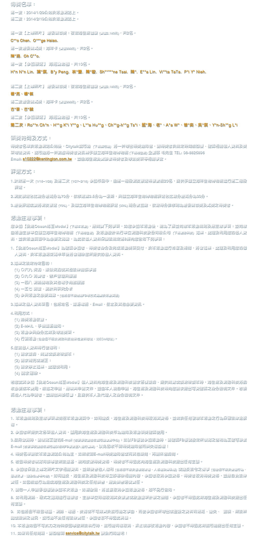 得獎者名單於活動網站公佈後,Citytalk城市通(下稱城市通)將一併寄出得獎通知信,請得獎者於規定時間前回覆、確認相關個人資料及獎項寄送資料,城市通將一併統整得獎者資訊轉予國立海洋生物博物館(下稱海生館)企劃部 毛先生 TEL: 08-8825896 Email: s10222@kentington.com.tw ,並由海生館負責聯繫得獎者及寄送獎項等相關事宜。