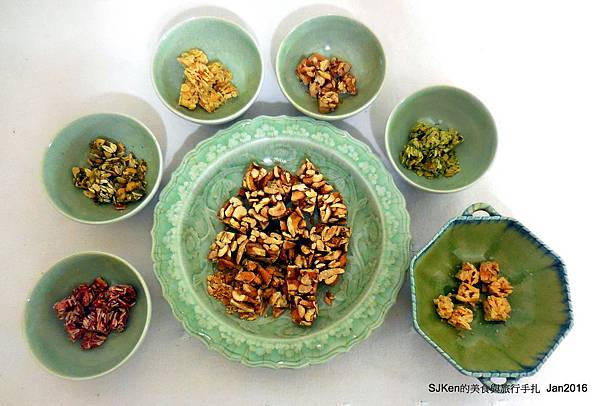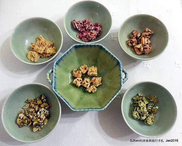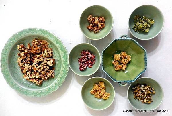 接著就來品嚐「南瓜子酥」、「腰果酥」、「原味杏仁酥」、「檸檬杏仁酥」、「洛神杏仁酥」與「海苔杏仁酥」6種口味各一試吃包,因為一包內裝的,約莫是兩三口的迷你份量,和家人一起嚐嚐鮮!