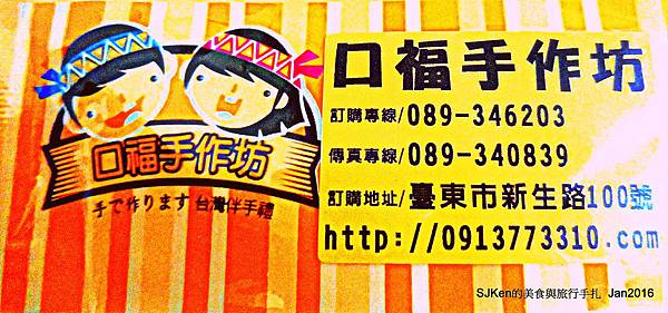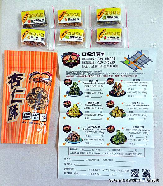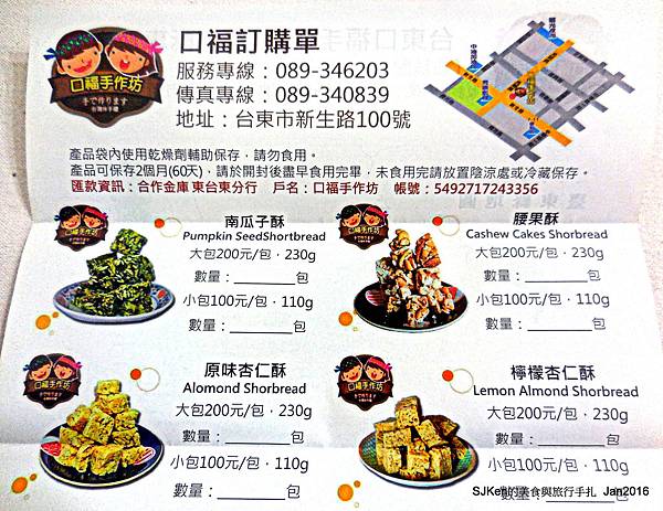 就這樣一次品嚐了「台東口福手作坊杏仁酥專賣店」七種迷人的風味口感,農曆年節在即,不管是自用送禮,只要一通電話 089-346203 ,或是填好訂購單,傳真至089-340839,匯款到指定戶名帳號,過年就可全家團圓開心品嚐來自美麗原鄉,台東知名伴手禮「口福手作坊」杏仁酥!