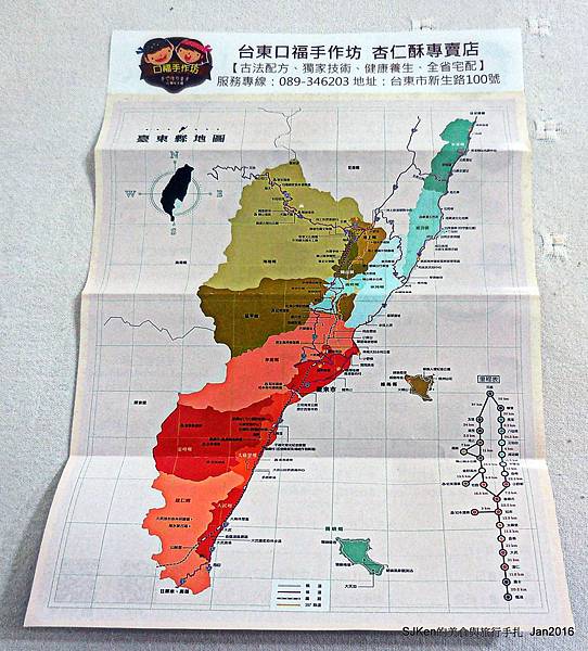 還有一張「台東口福手作坊杏仁酥專賣店」產品訂購單與一個白色小提袋。訂購單正面印有公司名稱、服務專線(089-346203)與店址(台東市新生路100號),店家強調產品依循古法配方與獨家技術製作,健康養生又美味,還提供全台宅配到家的服務。