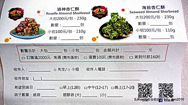 背面則是訂購單,上面印有產品圖照與數量登記欄(大包NT$200/包,230g,小包NT$100/包,110g),產品保存期限、保存方法、公司傳真與服務專線、訂購匯款帳號戶名,希望到貨實間等相關資訊,讓人一目了然!
