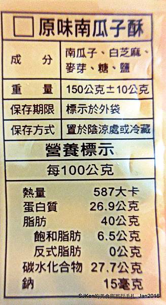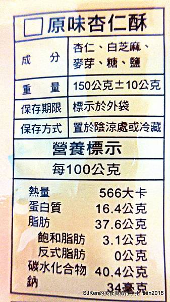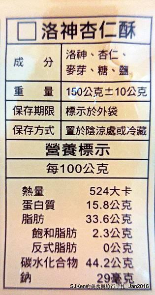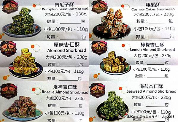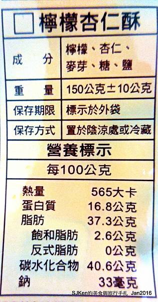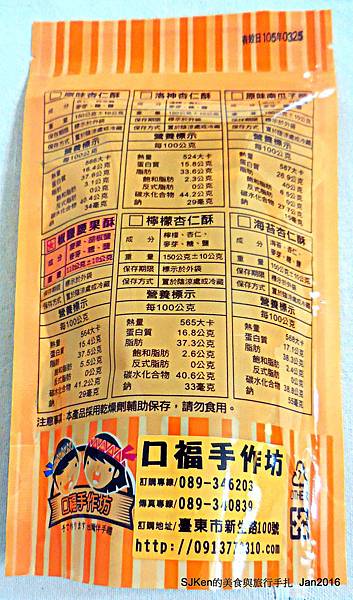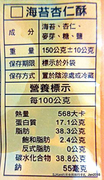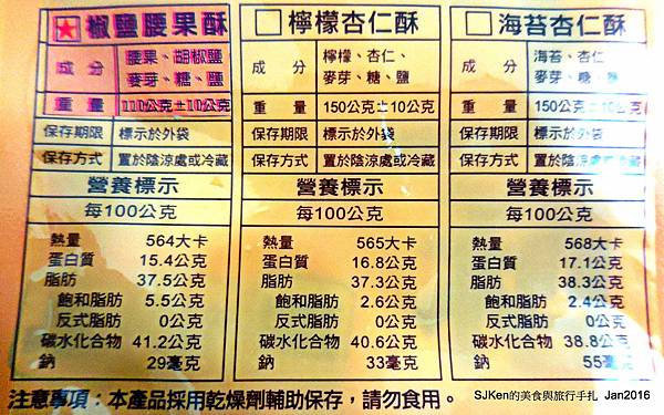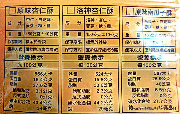 背面則是載明「原味杏仁酥」、「洛神杏仁酥」、「南瓜子酥」「椒鹽腰果酥」「檸檬杏仁酥」 與「海苔杏仁酥」6種口味的產品資訊,包括成份、重量、保存期限、保存方式與營養標示,讓人在食用前先了解吃下去的是甚麼,在享受美味的同時,也能比較安心。