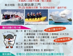 第一天 墾丁水上活動6合1 第二天 義大遊樂世界 第三天 山林雅境、苗栗桐花季