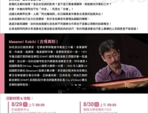 法國古典樂界紅牌、人稱「閃光魔術師」的日籍專業伴奏家古曵真則旋風來台! 出身指揮的他乃全方位音樂家,對於各色樂音有著極為細膩的瞭解。 透過示範與講解,如何依曲風變化音色與不同器樂合作再也不是難以理解的抽象概念! 古曵老師同時將分享演奏者正確放鬆並使用肌肉的技巧,對於想讓演奏技巧更上層樓的人來說更是不容錯過!